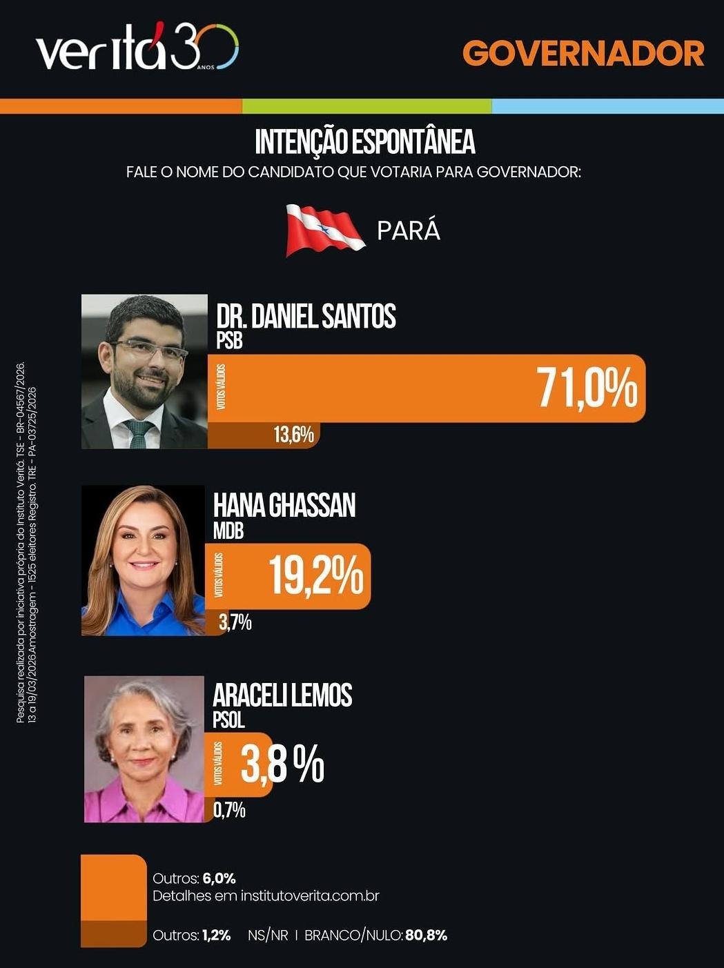 Um levantamento divulgado nesta quinta-feira (9) pelo Instituto Veritá indica um cenário de vantagem significativa na corrida pelo Governo do Pará, com destaque para a liderança do pré-candidato Daniel Santos, que aparece à frente com ampla margem sobre os demais concorrentes.