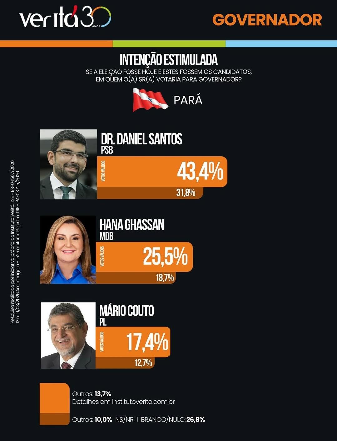 De acordo com os dados, considerando os votos válidos, Daniel Santos soma 43,4% das intenções de voto, consolidando a primeira colocação. Na sequência, a pré-candidata Hana Ghassan registra 25,5%, enquanto Mário Couto aparece em terceiro lugar, com 17,4%. Outros nomes somam 13,7% no cenário apresentado.