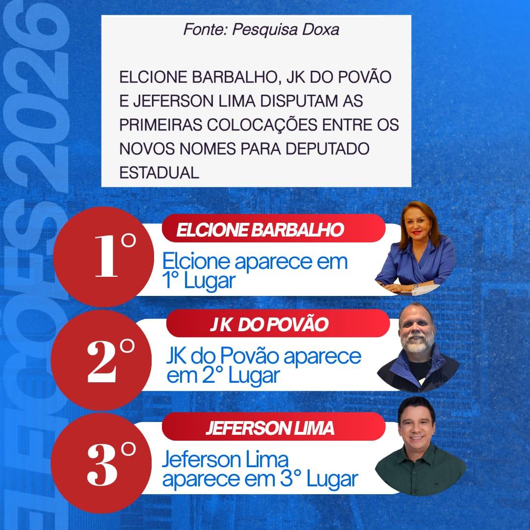 A mais recente pesquisa do instituto Doxa, que avaliou 32 novos nomes já colocados no cenário político como pré-candidatos a deputado estadual, revela um desempenho expressivo de JK do Povão (PL), que desponta entre os principais nomes da disputa e consolida sua força eleitoral. O levantamento aponta a deputada federal Elcione Barbalho (MDB) na liderança, com 9,84% das intenções de voto, mas é a segunda colocação de JK do Povão que chama a atenção: com 3,81%, o ex-vereador e ex-candidato a prefeito de Santarém aparece isolado logo atrás de Elcione, e à frente de figuras tradicionais da política paraense.